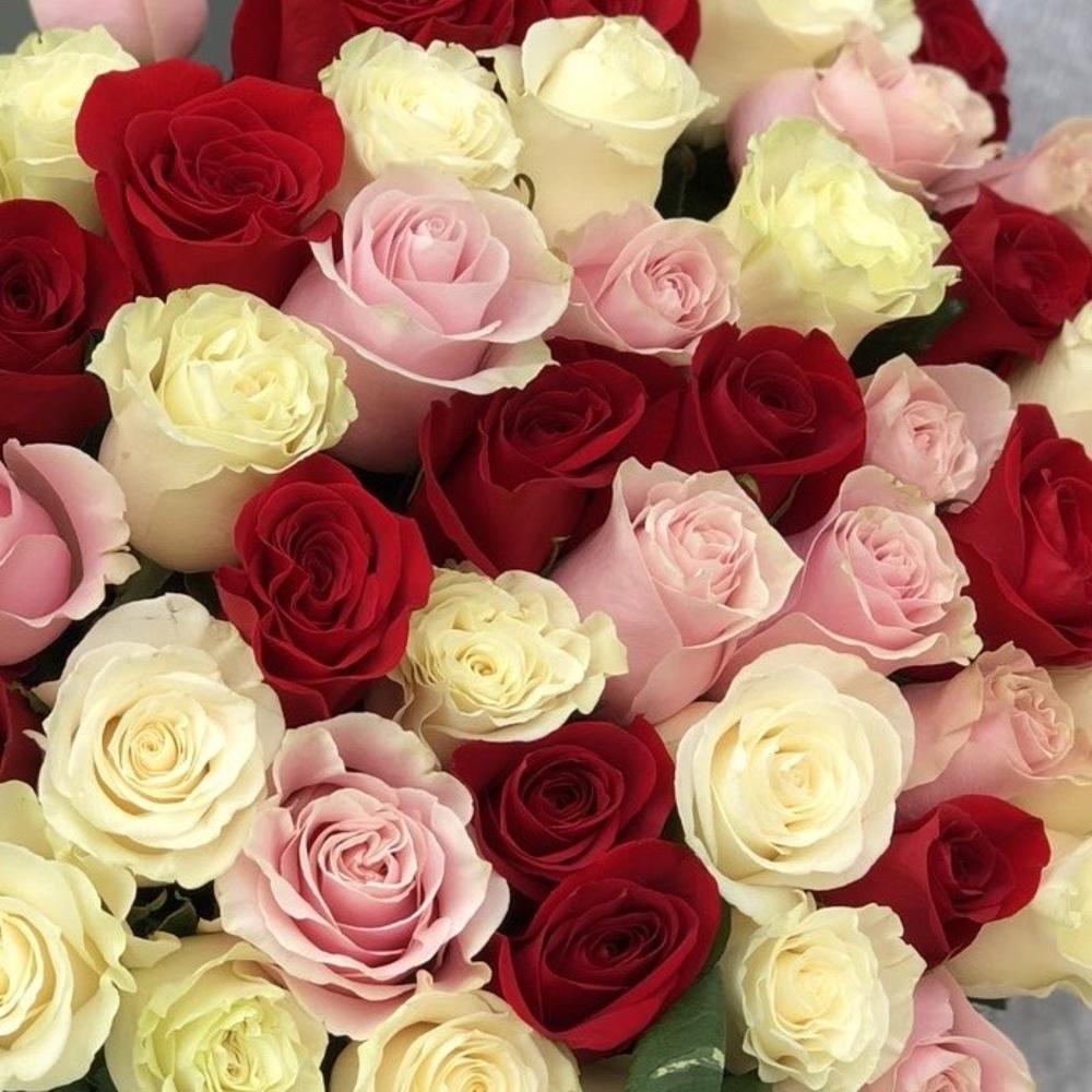 роза красная фридом – 16 шт. Роза белая мондиаль – 20 шт. роза розовая пинк мондиаль – 15 шт. Оформление лента атласная – 1 шт.