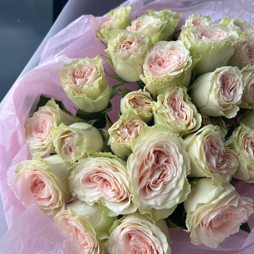Кустовая пионовидная роза – 9 шт.декоративная упаковка – 1 шт.Атласная лента – 1 шт.