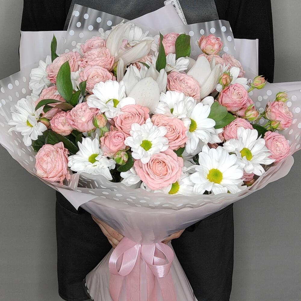 Роза кустовая – 5 шт.Рускус – 5 шт.Лента атласная – 1 шт.орхидея – 3 шт.Упаковка дизайнерская – 1 шт.Хризантема Ромашковая – 5 шт.