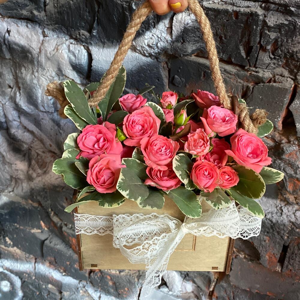 Букет из кустовых роз и зелени в деревянном ящике “Красотка”