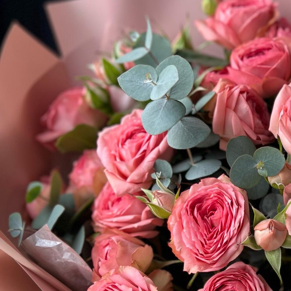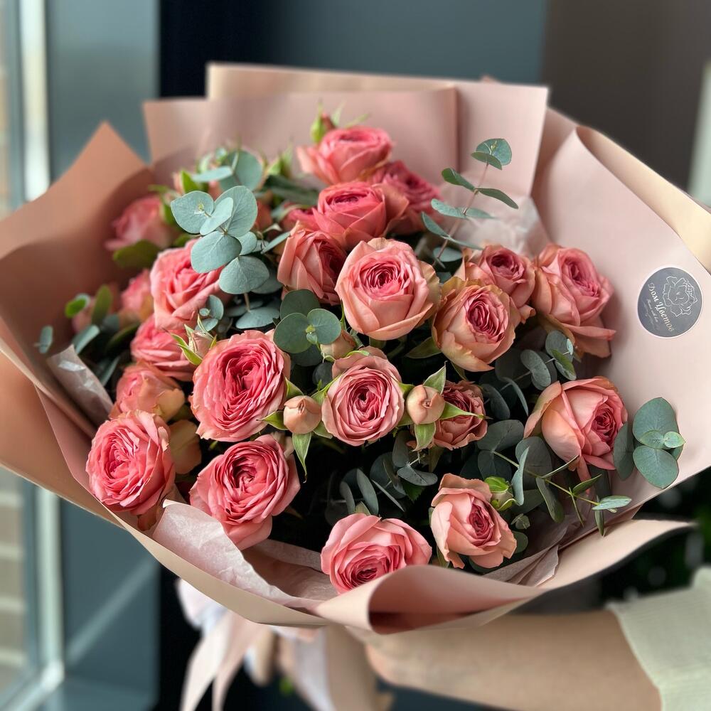 Букет из пионовидной кустовой розы и эвкалипт
