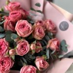 Кустовая пионовидная роза – 5 шт.Эвкалипт – 3 шт.декоративная упаковка – 1 шт.Атласная лента – 1 шт.