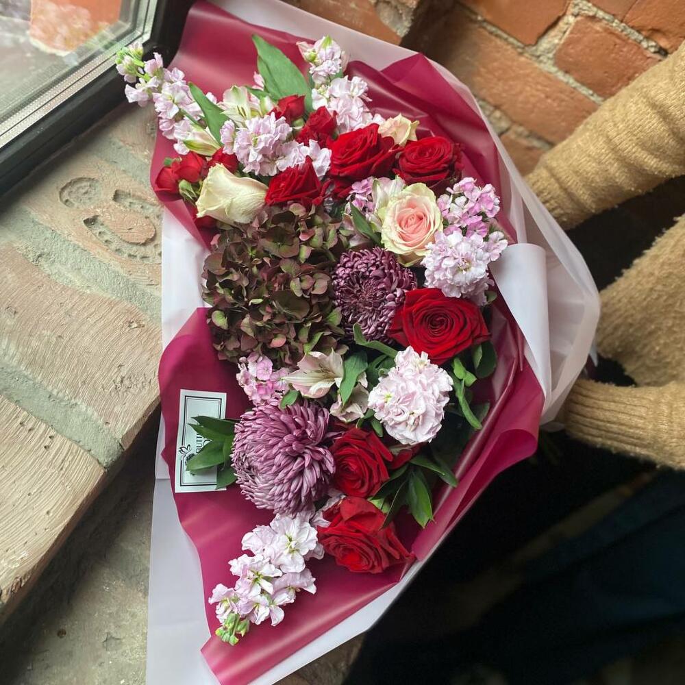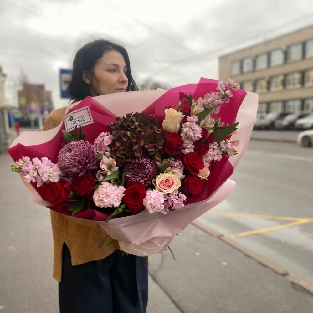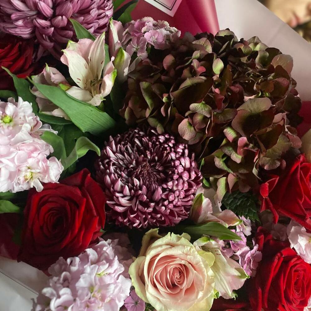 Роза красная – 6 шт.Роза розовая – 3 шт.Роза кустовая – 2 шт.Гортензия – 1 шт.Хризантема – 2 шт.Маттиола – 6 шт.Альстромерия – 4 шт.Рускус – 3 шт.Диантус – 3 шт.Упаковка – 2 шт.