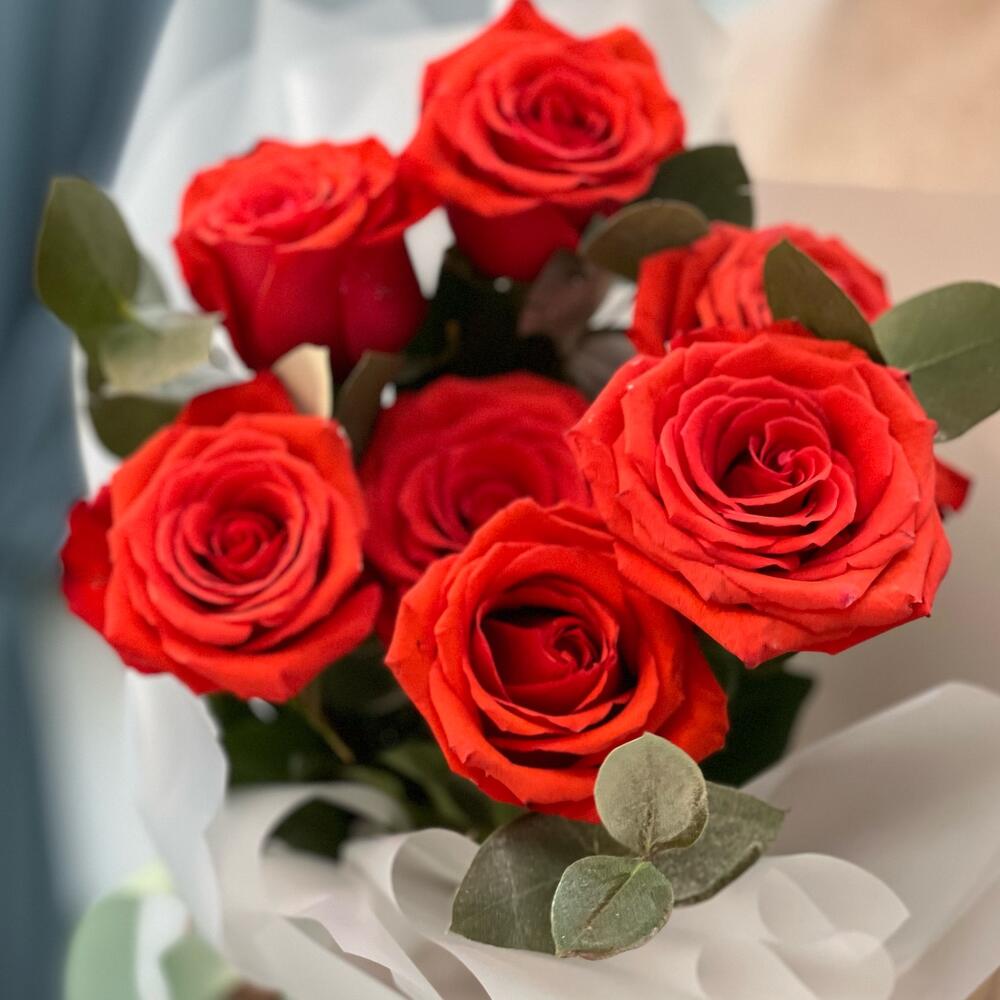 Роза красная Эквадор – 7 шт.Эвкалипт – 2 шт.Корейская пленка – 2 шт.Лента атласная – 1 шт.