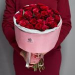 Букет красных роз в розовой упаковке