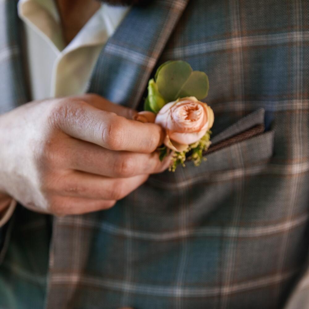 Суккулент – 5 шт.Пионовидная кустовая роза – 5 шт.Диантус – 7 шт.Эвкалипт – 5 шт.Лента атласная – 1 шт.