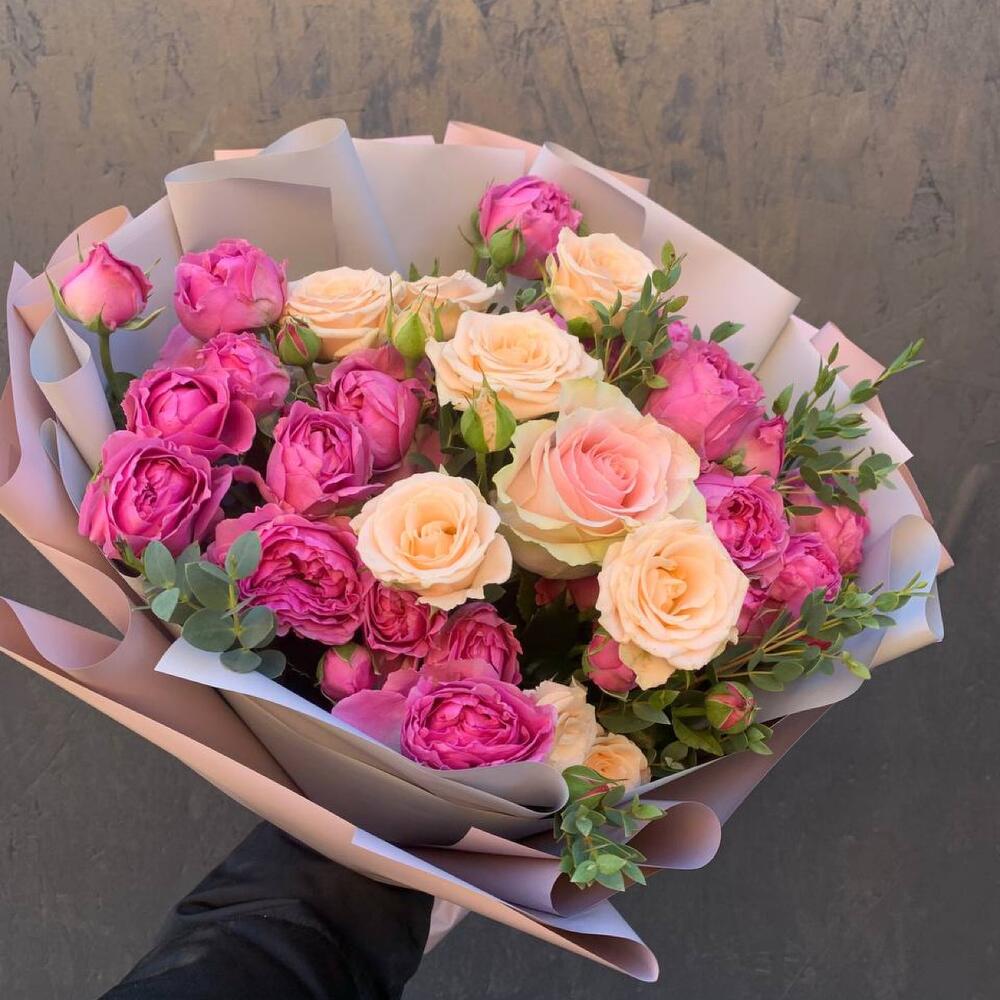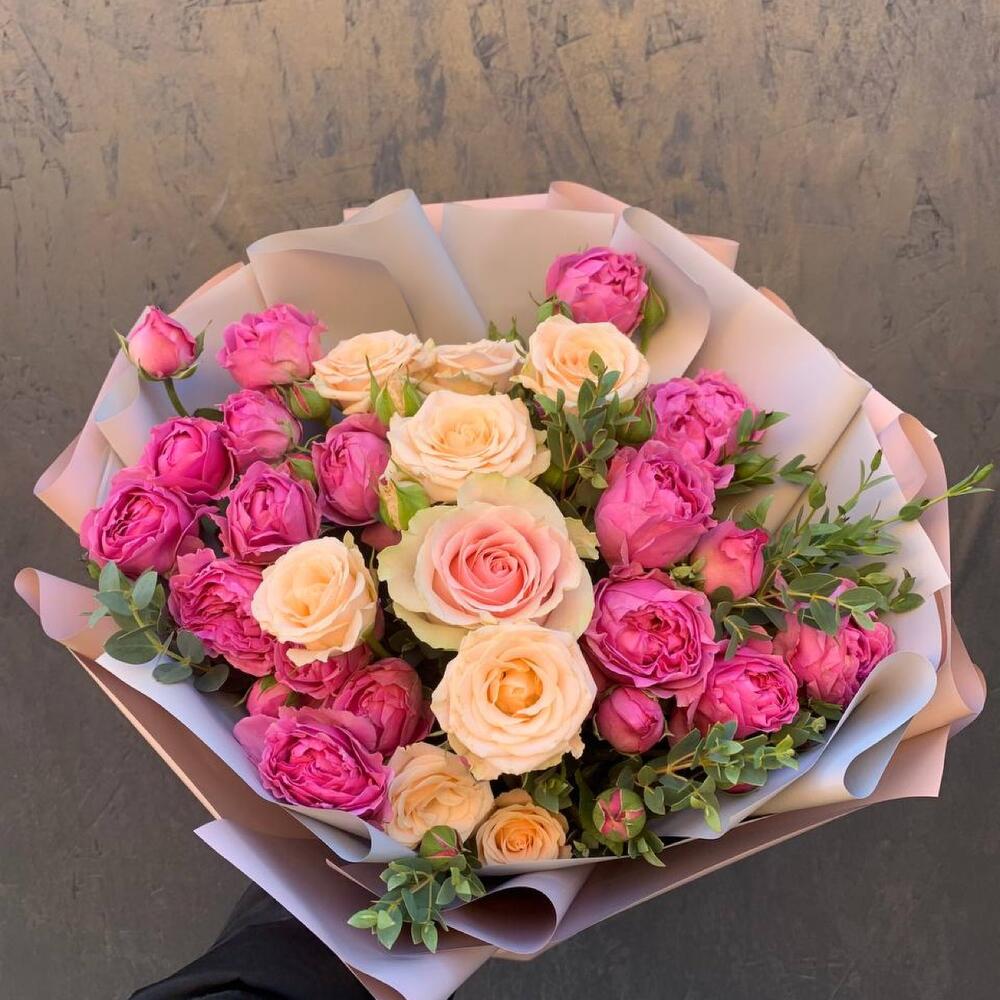 Букет пионовидных роз с кустовыми и эвкалиптом