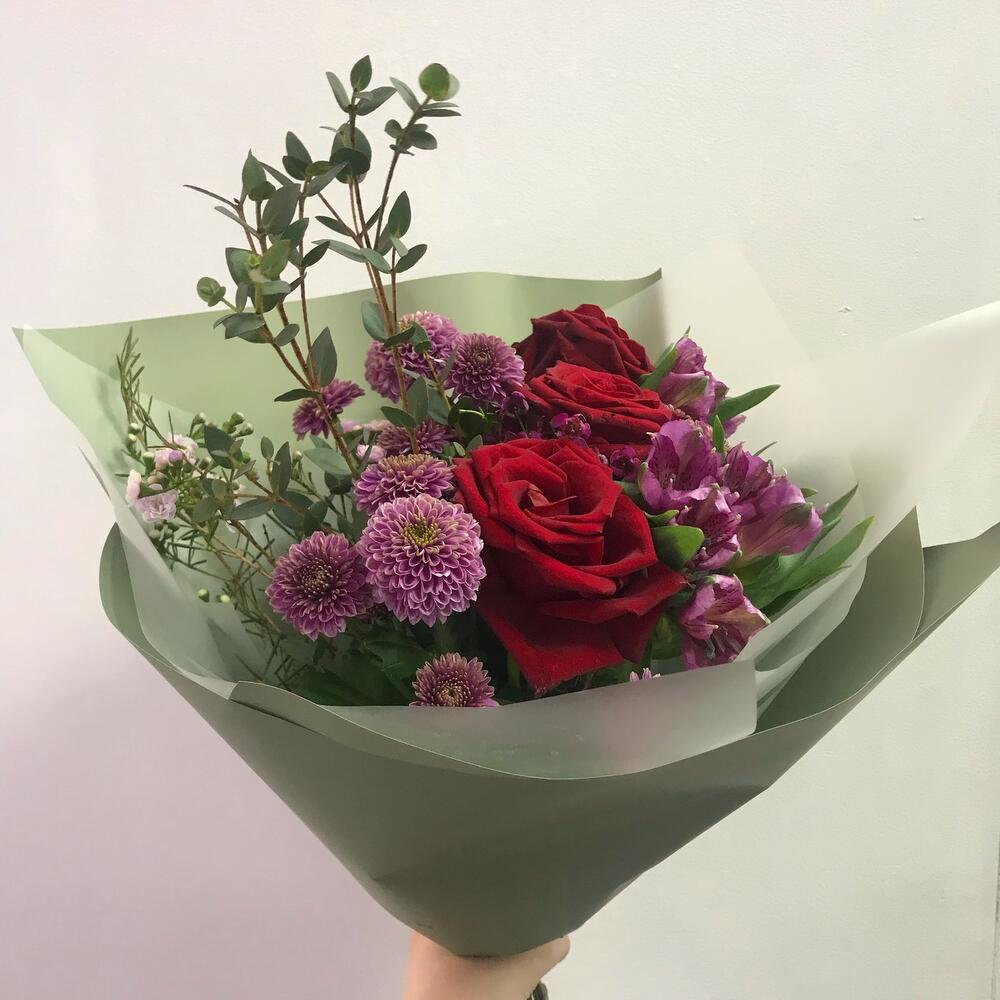 Роза красная – 3 шт.Эвкалипт – 1 шт.Хризантема Сантини – 3 шт.Хамелациум – 2 шт.Альстромерия – 2 шт.Авторская упаковка – 1 шт.Открыточка с вашими пожеланиями – 1 шт.