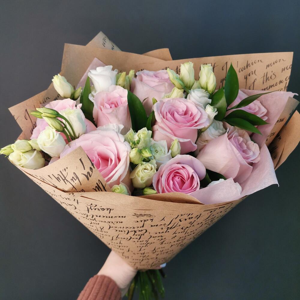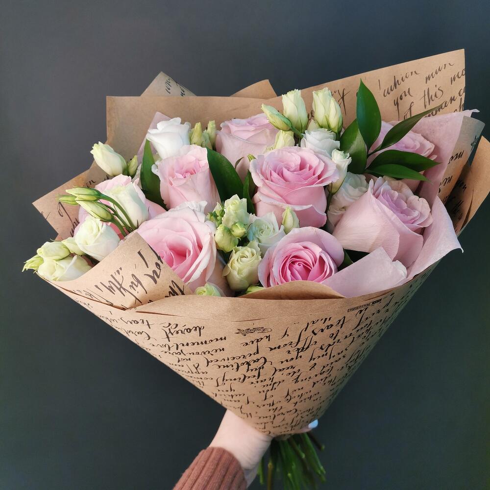 Роза Эквадор – 7 шт.Эустома – 5 шт.зелень декоративная – 5 шт.Упаковка дизайнерская – 1 шт.