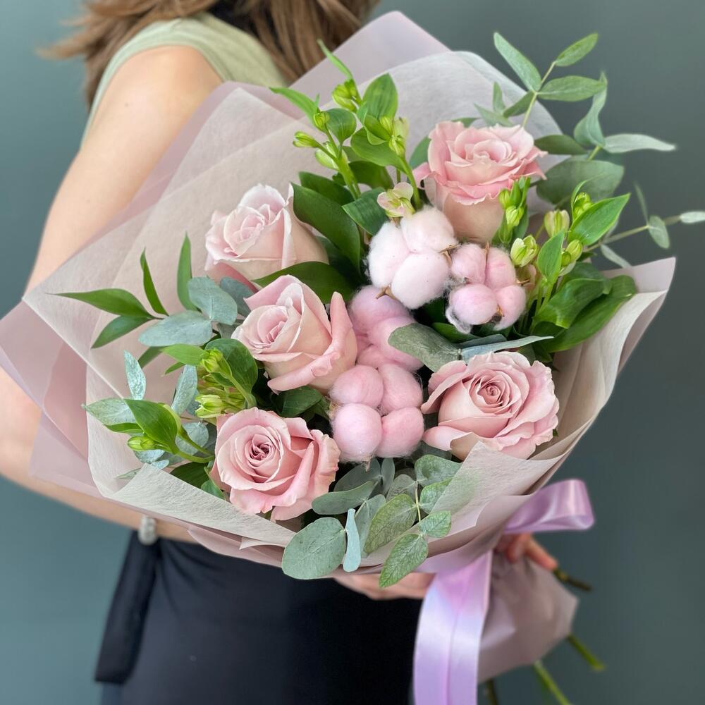 Альстромерия – 3 шт.Лента – 1 шт.Рускус – 5 шт.Хлопок – 4 шт.Эвкалипт – 2 шт.Роза одноголовая – 5 шт.бумага упаковочная – 1 шт.