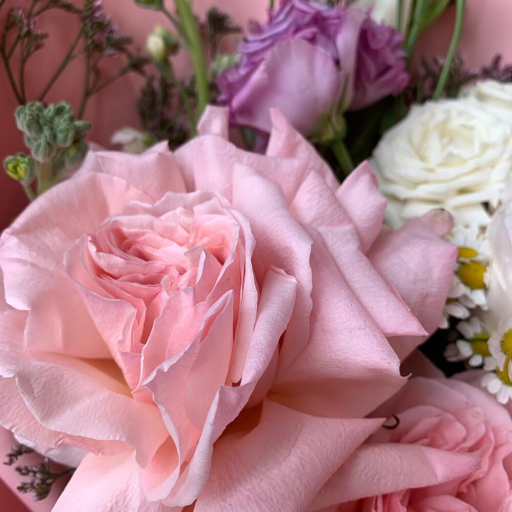 Букет с пионовидной розой, лизиантус и пион «Романтик»