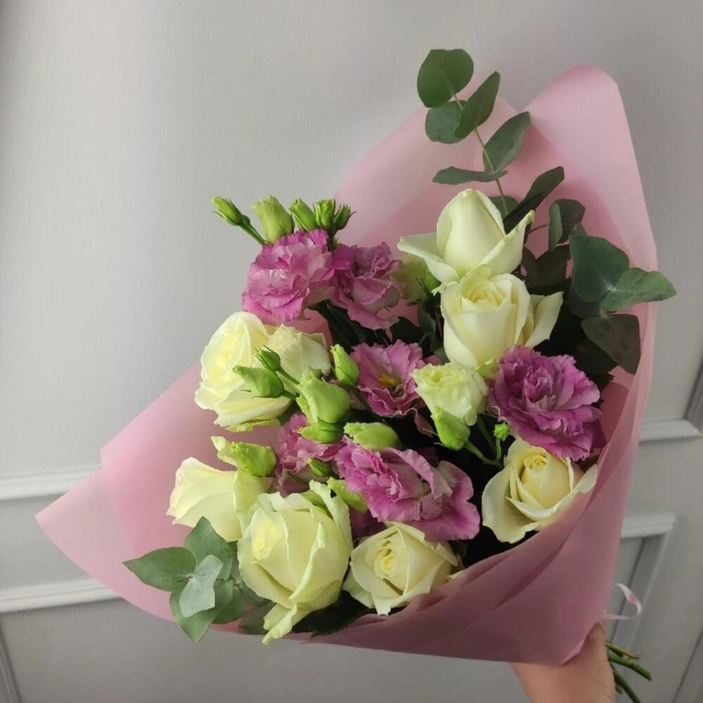 Лента – 1 шт.Эвкалипт – 2 шт.Роза – 7 шт.Лизиантус – 2 шт.Матовая пленка – 1 шт.