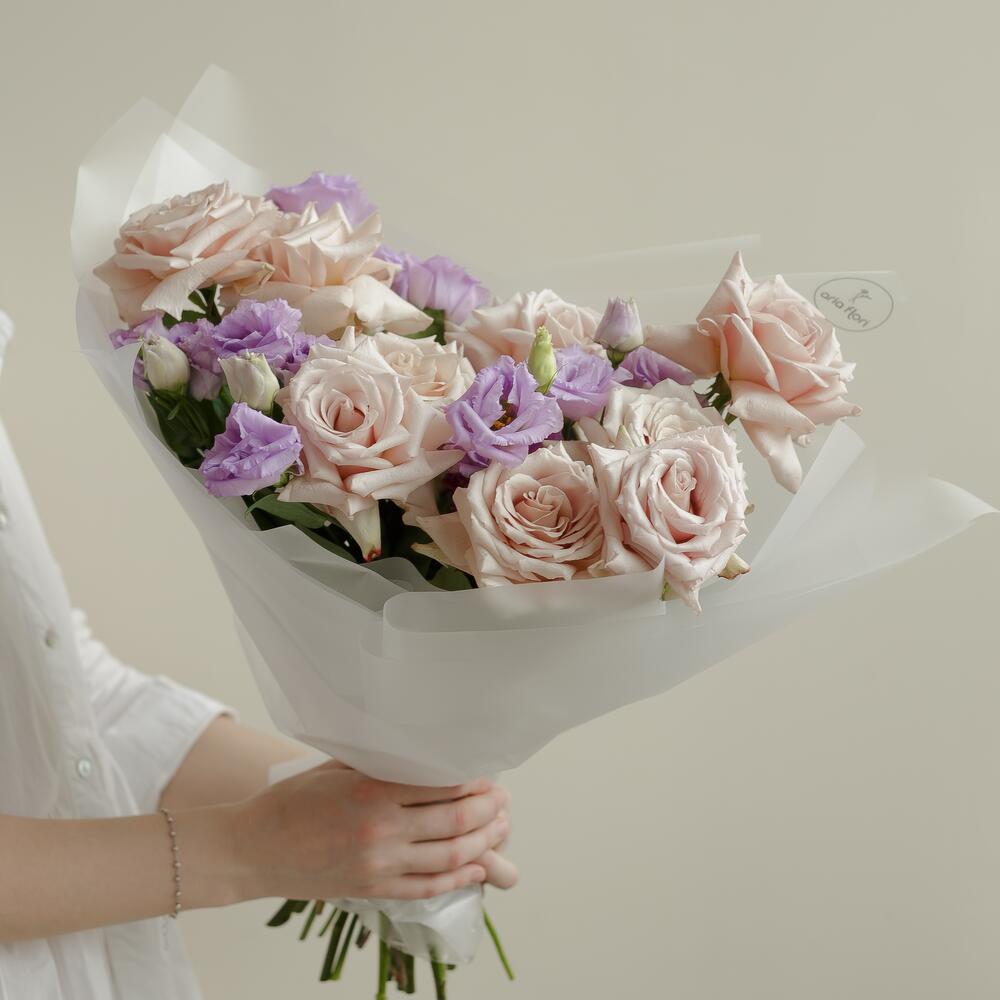 Роза Эквадор – 9 шт.Гвоздика – 2 шт.Эустома – 6 шт.Фисташка – 2 шт.Упаковка дизайнерская – 1 шт.подкормка для срезанных цветов – 1 шт.инструкция по уходу за цветами – 1 шт.записка с вашим текстом – 1 шт.медиант ручной работы из бельгийского шоколада – 1 шт.