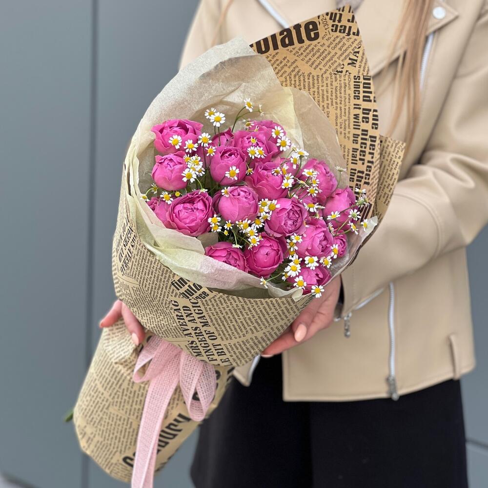 Кустовая пионовидная роза – 5 шт. ромашки (танацетум) – 6 шт. Оформление – 1 шт.