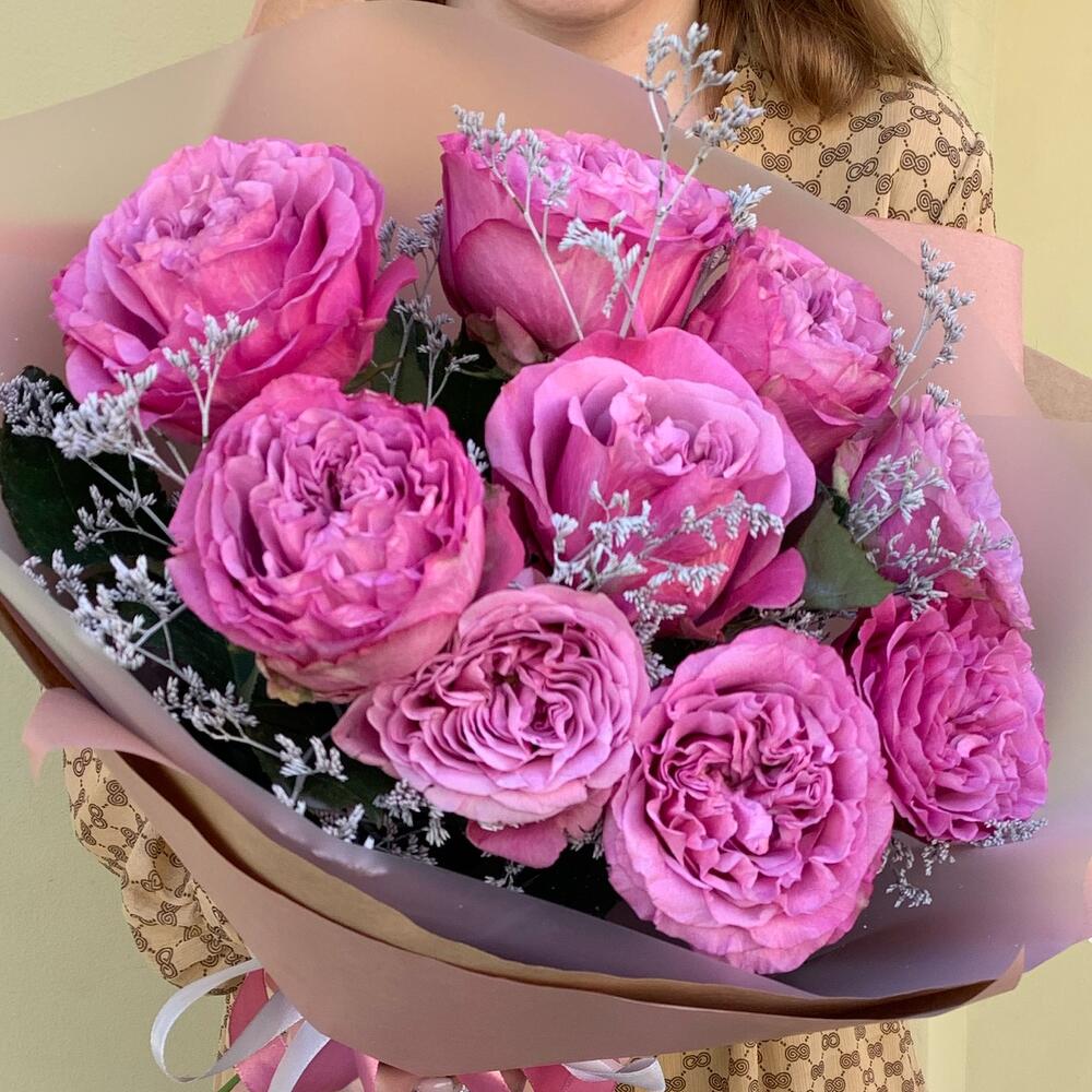 ЧЕРНИЧНЫЙ ЙОГУРТ 9 премиальных пионовидных роз с белым лимониумом в крафт бумаге