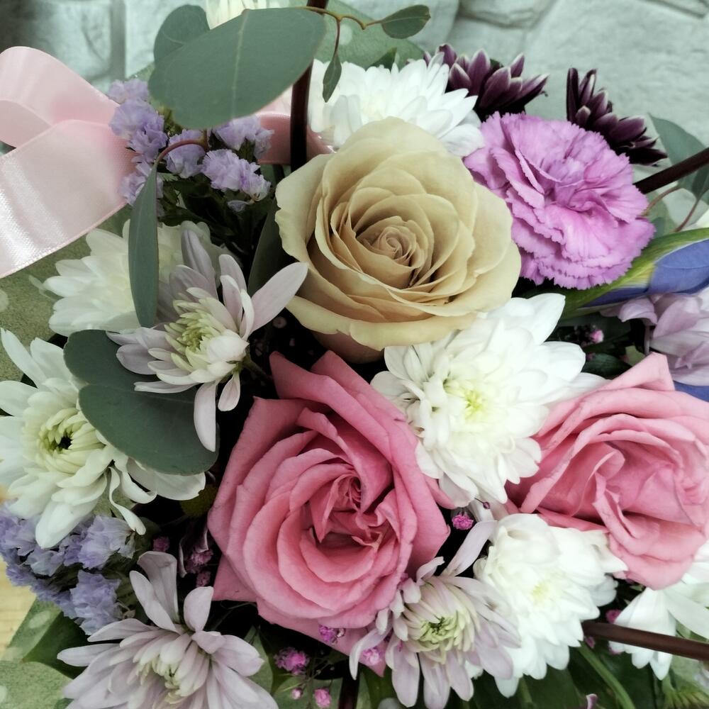 Хризантема кустовая – 2 шт.Роза – 3 шт.Лента атласная – 1 шт.Гвоздика сортовая – 1 шт.Ирис Blue Magic – 2 шт.Статица сиреневая – 1 шт.Сумочка картонная – 1 шт.Упаковка фетр – 1 шт.