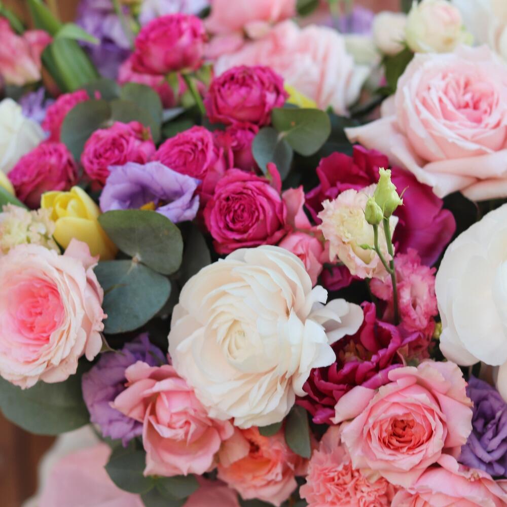 Цветы в большой коробке: садовые розы, лизиантус, маттиола, тюльпаны