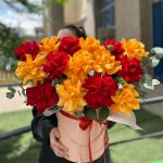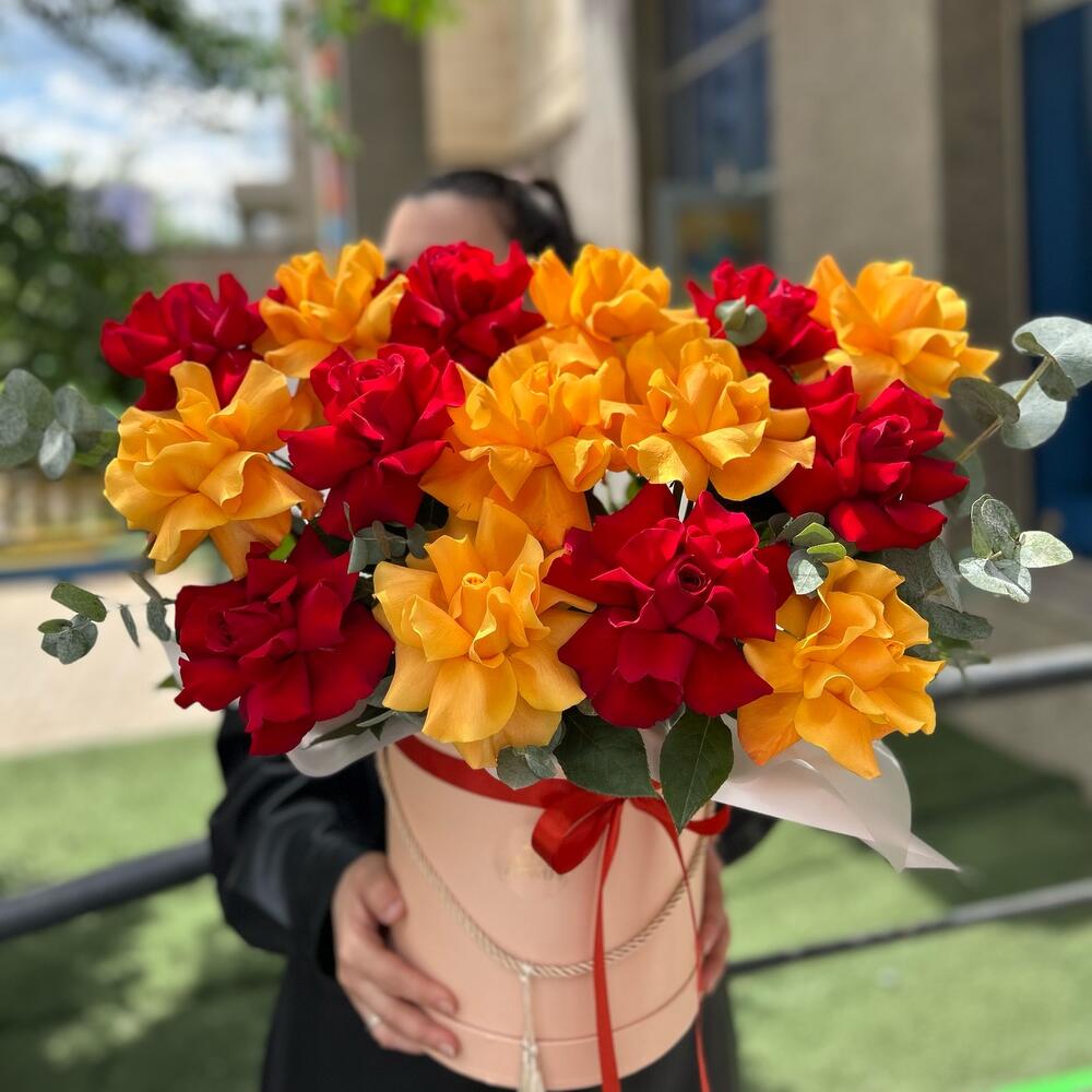 Букет из оранжевых роз в шляпной коробке