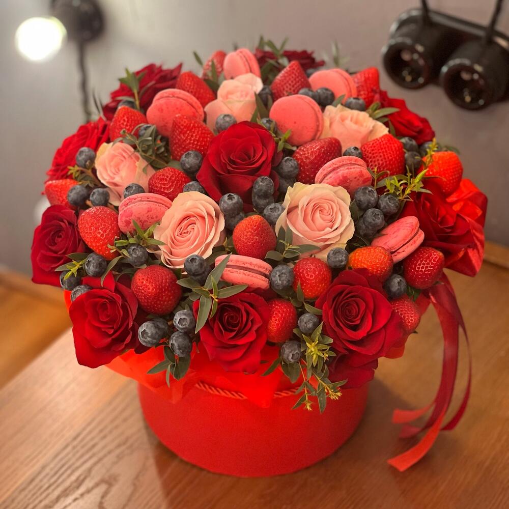 Цветы в коробке красные розы, клубника и пирожные макаронс