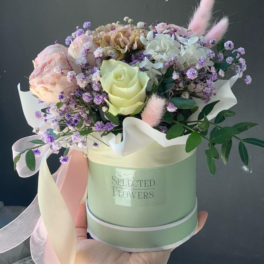 Букет из гортензии, эригниума, лизиантуса и роз "Сердце весны"