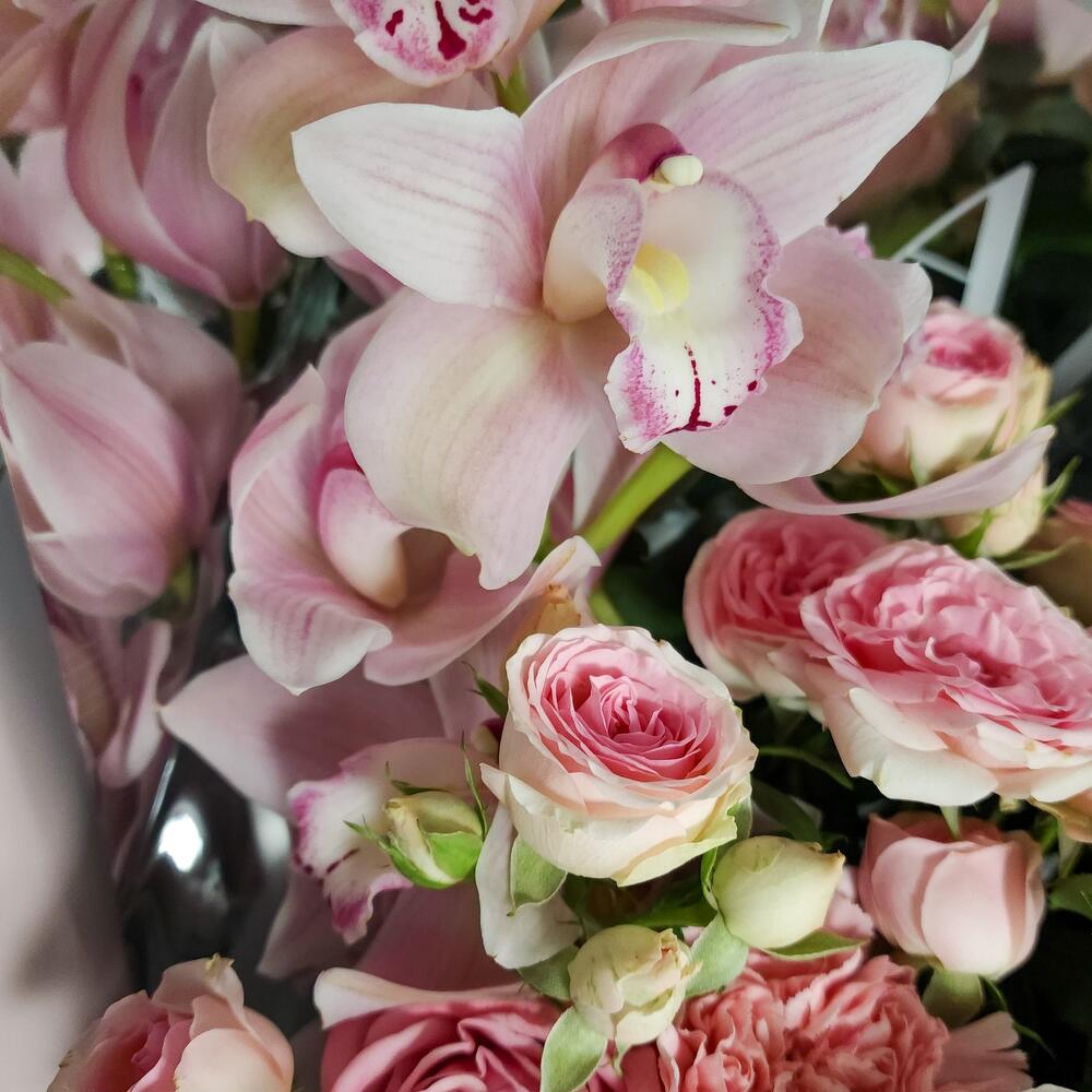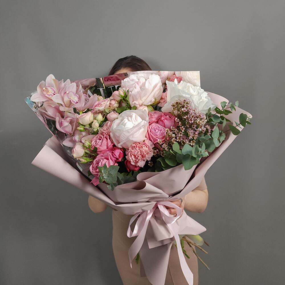 Ваксфлауэр – 1 шт.Орхидея Цимбидиум – 1 шт.Пион – 3 шт.Роза кустовая – 3 шт.Диантус – 3 шт.Аквапак – 1 шт.Дизайнерская упаковка – 1 шт.подкормка для срезанных цветов – 2 шт.