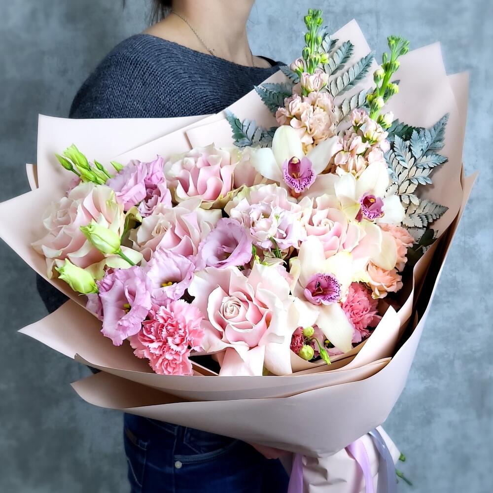 Альстромерии, Гвоздики, Кустовые розы, Лизиантусы, Розы, Хризантемы