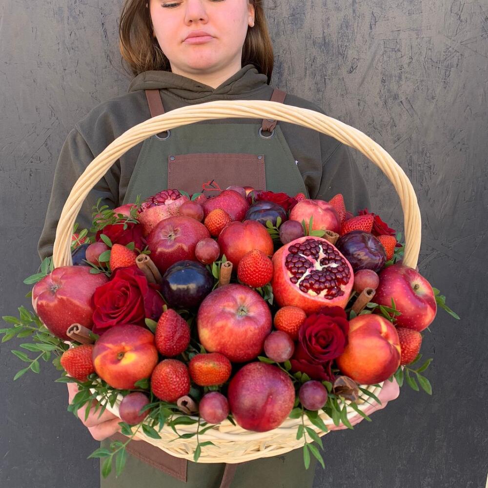 Клубника – 250 гр.Корица – 10 шт.Роза красная – 6 шт.Лента атласная – 2 шт.Гранат – 2 шт.Фисташка – 3 шт.Корзина плетеная – 1 шт.Оазис флористический – 2 шт.яблоко красное – 7 шт.черешня или виноград – 200 гр.нектарин или слива – 6 шт.