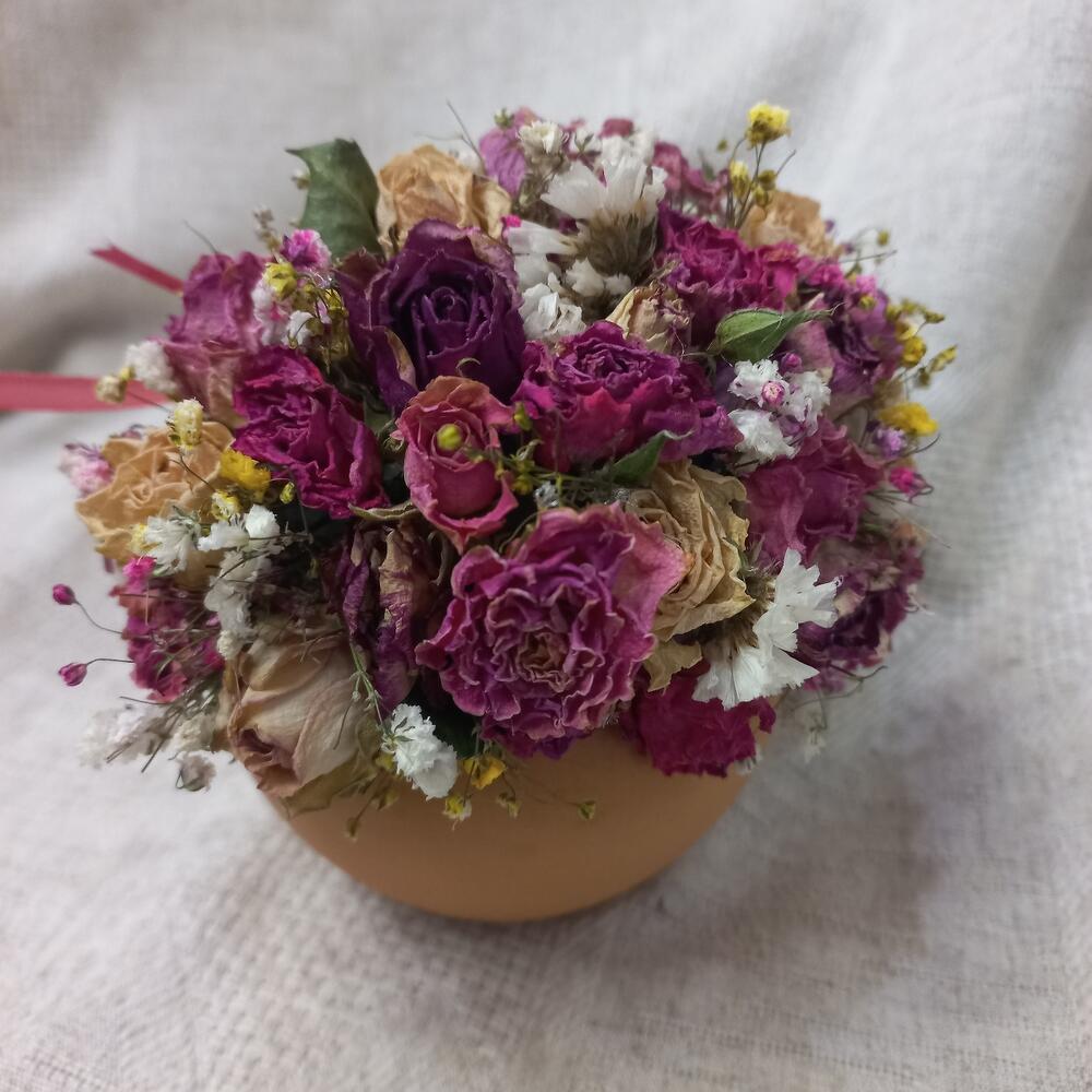 роза кустовая микс сухоцвет – 23 шт.статица сухоцвет – 2 шт.гипсофила сухоцвет – 3 шт.Оазис флористический – 1 шт.горшочек с крышкой керамический – 1 шт.