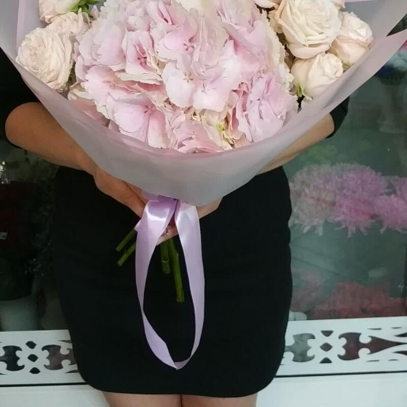 Гортензия – 1 шт.Роза кустовая – 3 шт.Оформление – 1 шт.