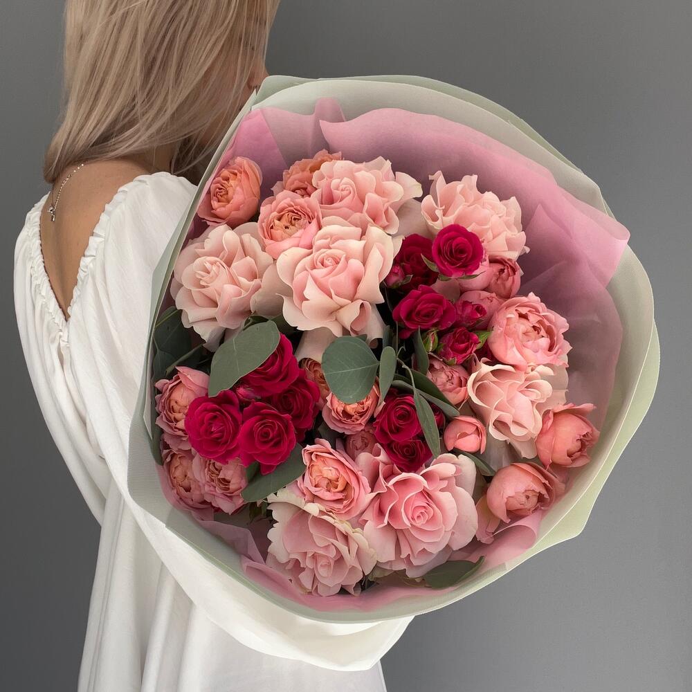 15 пионовидных роз Кахала с веточками эвкалипта