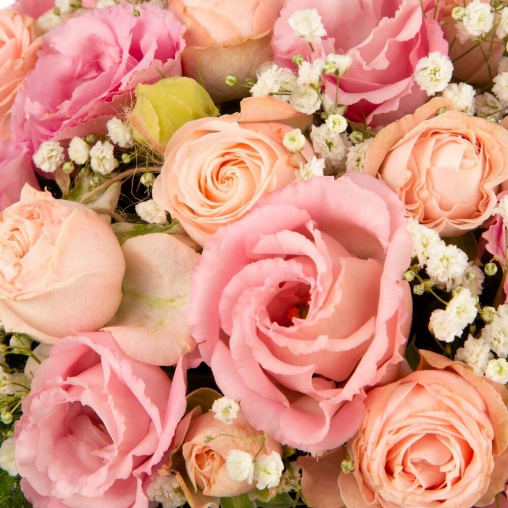 Цветы: кустовая роза, лизиантус, гипсофилия.