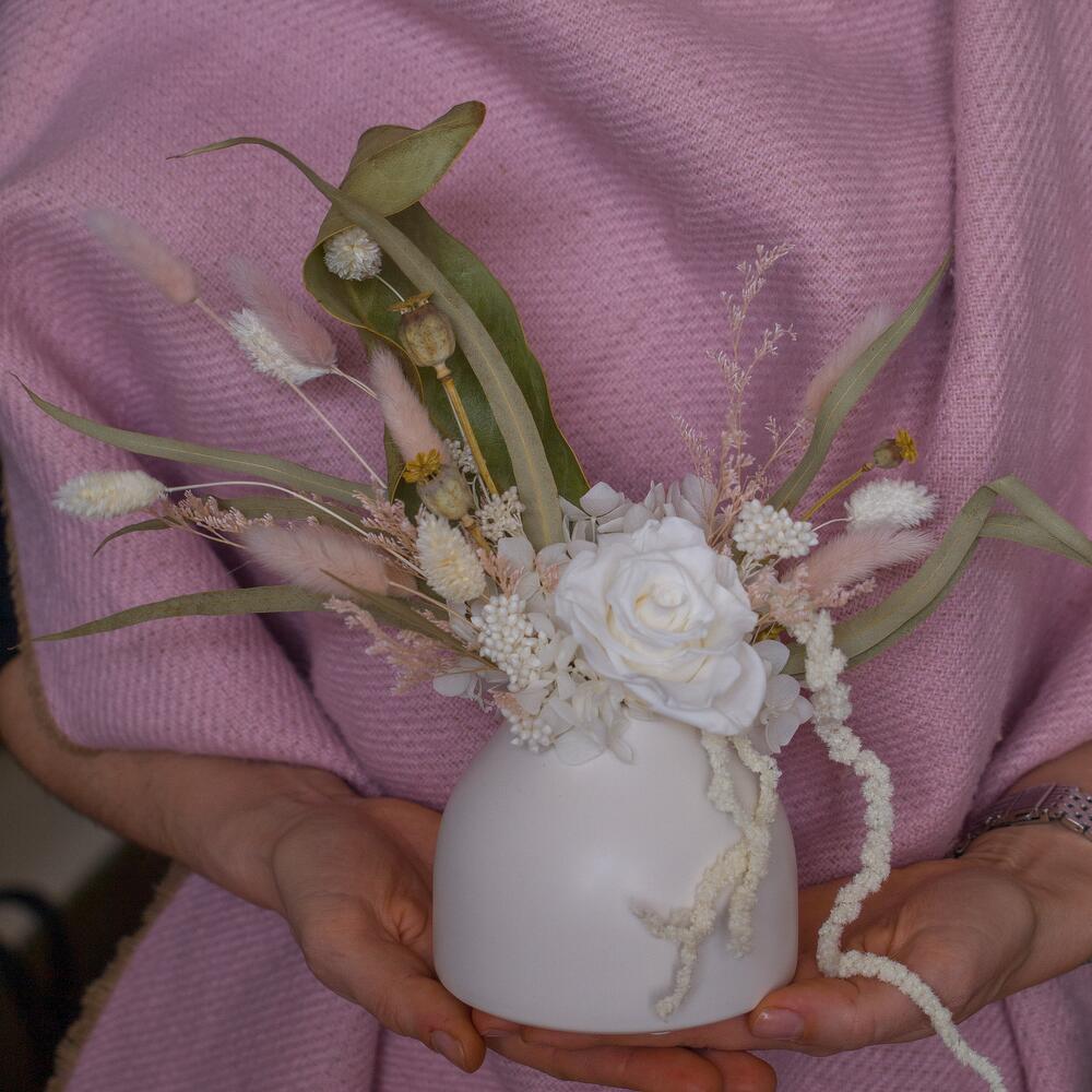 Композиция из сухоцветов и стабилизированных цветов в белом кашпо