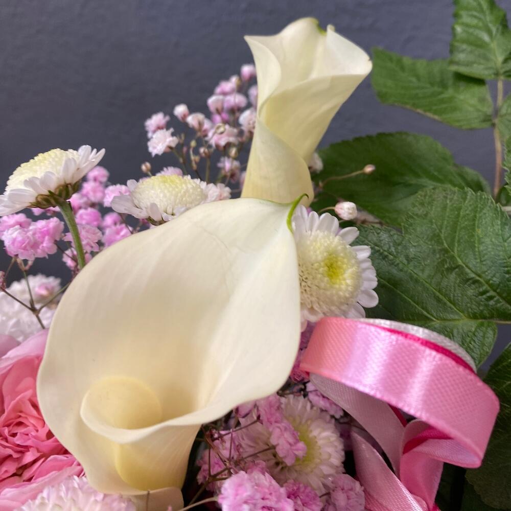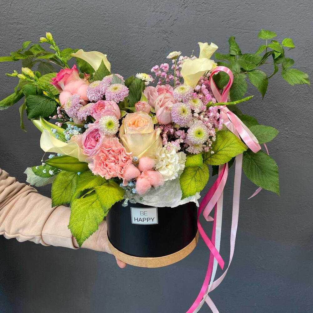 Гипсофила – 2 шт.Калла – 4 шт.Лилия – 1 шт.Роза кустовая – 2 шт.Хлопок – 2 шт.Гвоздика – 2 шт.Коробка шляпная – 1 шт.Сантини – 4 шт.