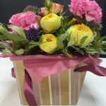 Роза кустовая – 1 шт.Гвоздика – 3 шт.листья фисташки – 1 шт.Трахелиум – 1 шт.Коробка – 1 шт.Оазис – 1 шт.Лента атласная – 1 шт.