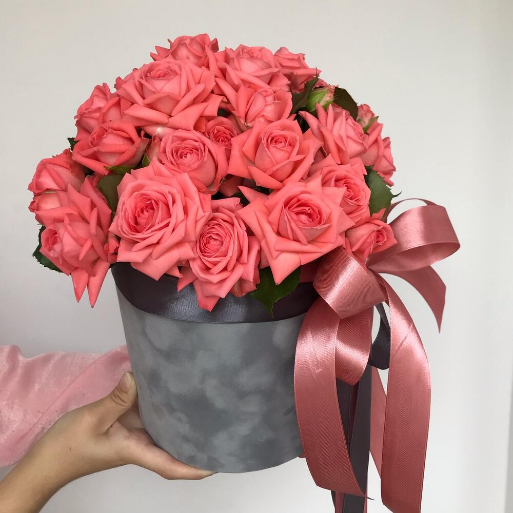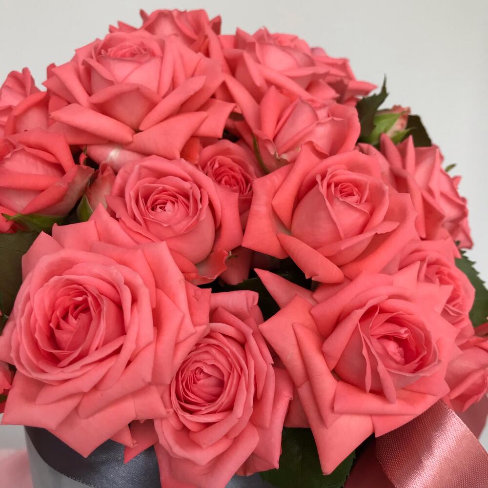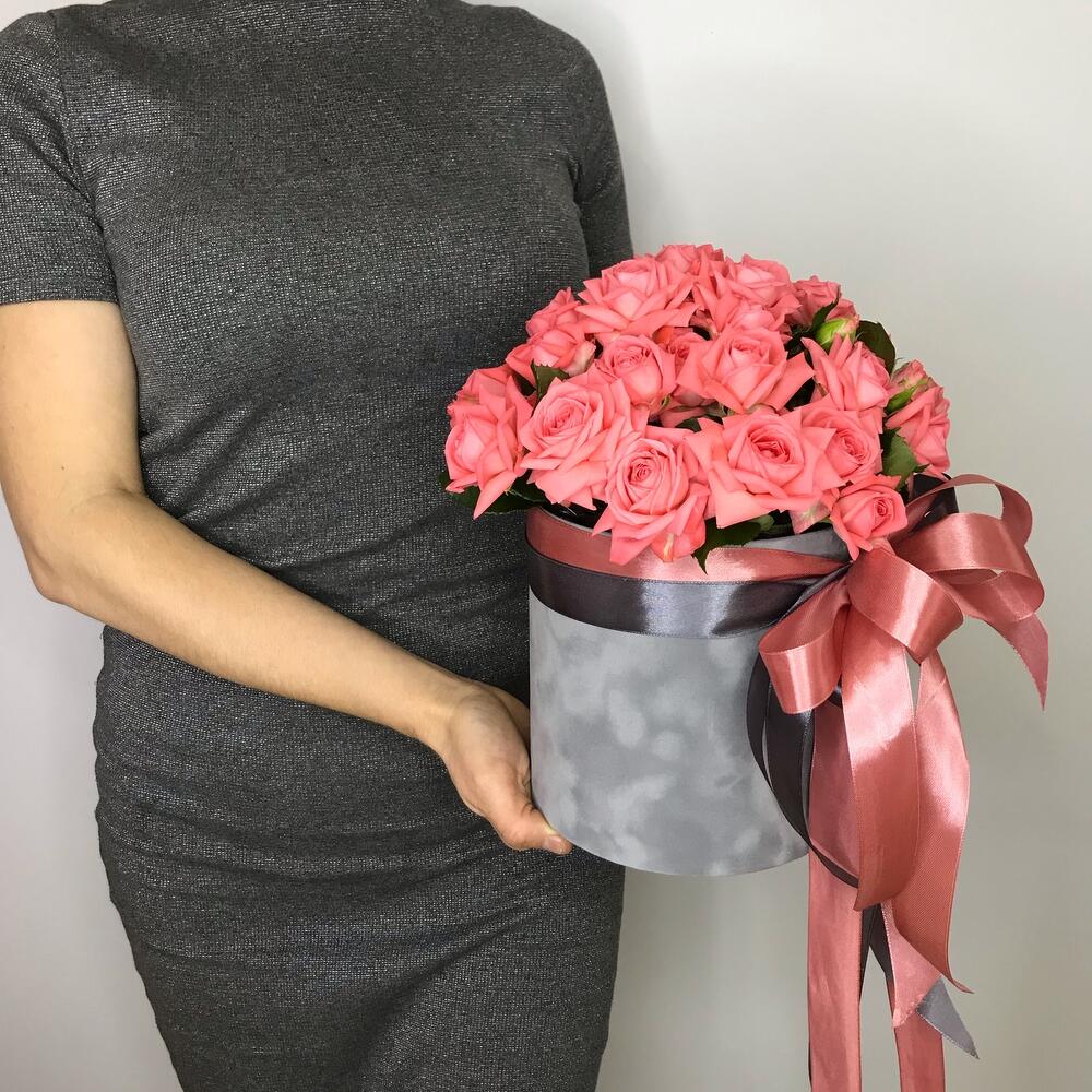 Лента атласная – 2 шт.Роза кустовая Барбадос – 11 шт.Шляпная бархатная коробка – 1 шт.биафлора – 1 шт.инструкция по уходу за цветами в флористической губке – 1 шт.