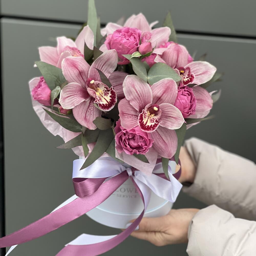 Коробочка из кустовых пионовидных роз сорта Misty Bables и цимбидиума