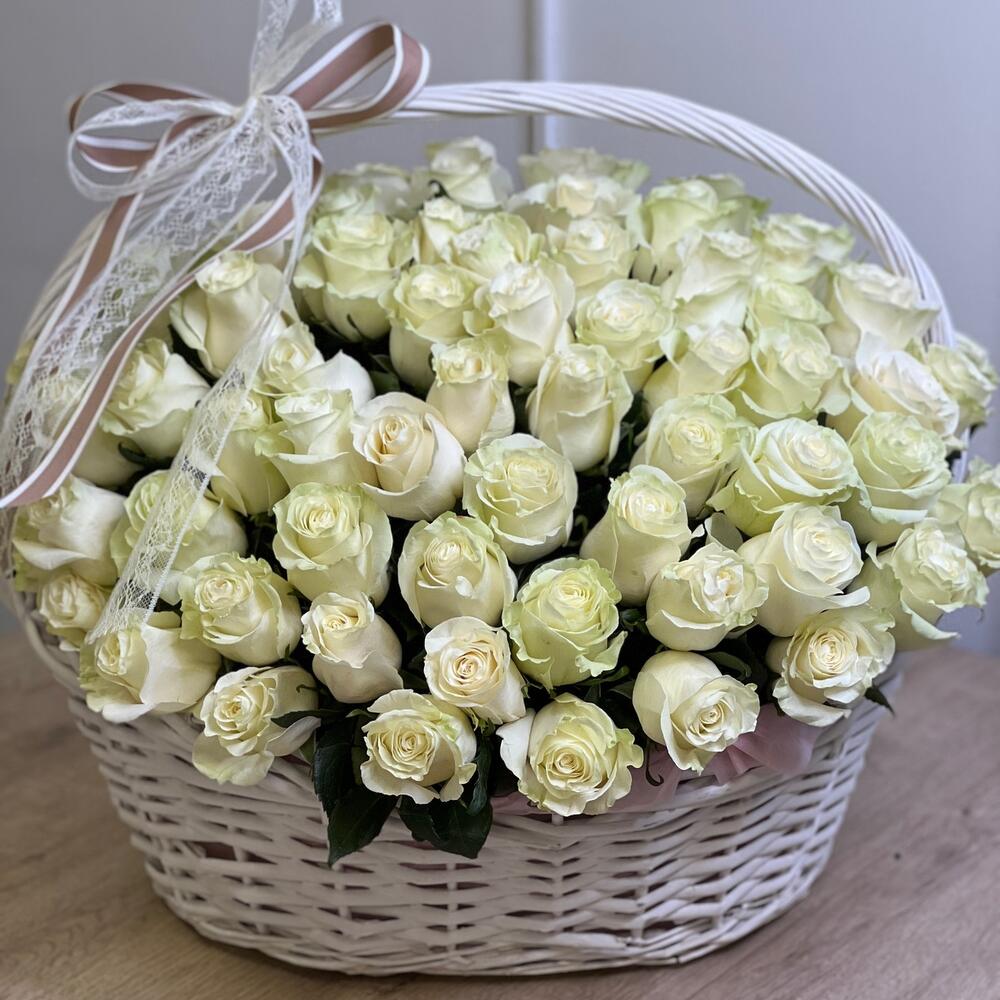Метки: 101 роза, 14 февраля, Белые розы, от 5000 руб, Роза Роза 40 см, Розы в корзине, цветы в корзине