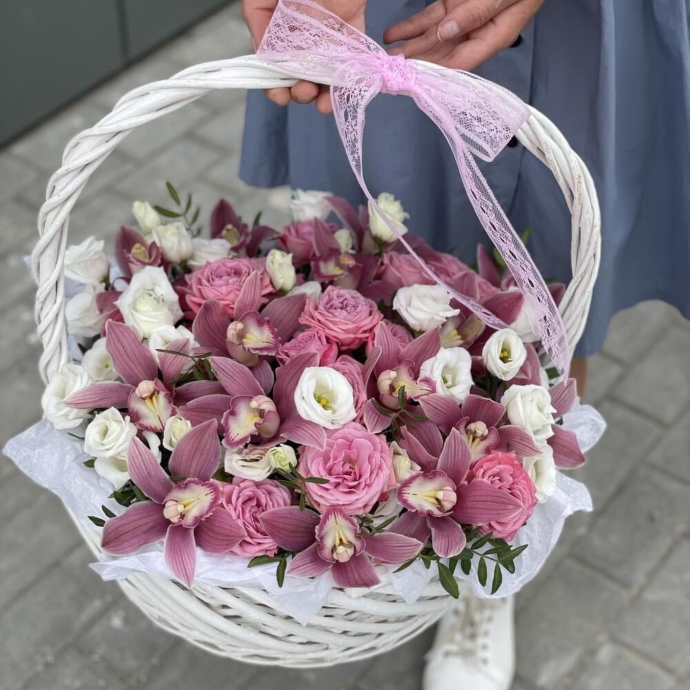 Корзина из цветков орхидеи, роз, эустомы и зелени!
