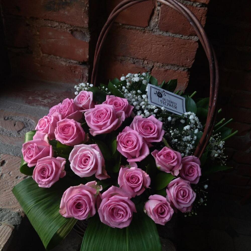 Роза Эквадор – 19 шт.Аспидистра – 3 шт.Гипсофила – 3 шт.Зелень – 1 шт.Корзина – 1 шт.