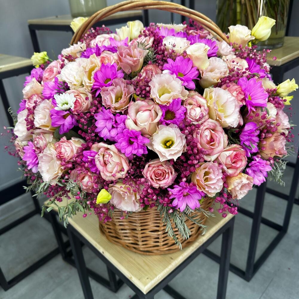 Роза – 29 шт. Хризантема – 33 шт. Эустома – 11 шт. зелень декоративная – 5 шт. Корзина плетеная – 1 шт.