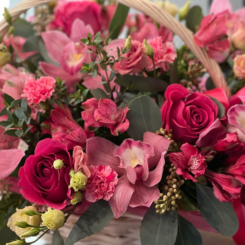 Орхидея цимбидиум бутон – 7 шт.Диантус кустовой – 9 шт.Альстромерия – 7 шт.Роза Эквадор – 7 шт.Эвкалипт Микс – 20 шт.Корзина плетеная – 1 шт.Оазис флористический – 1 шт.Лента атласная – 2 шт.Тишью – 7 шт.работа флориста – 1 шт.