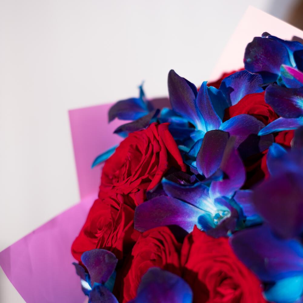 Лента атласная – 1 шт.Дизайнерская упаковка – 2 шт.подкормка для срезанных цветов – 1 шт.инструкция по уходу за цветами – 1 шт.орхидеи дендробиум цветки – 16 шт.любовь флориста (бесплатно) – 1 шт.красные роза гран-при – 11 шт.