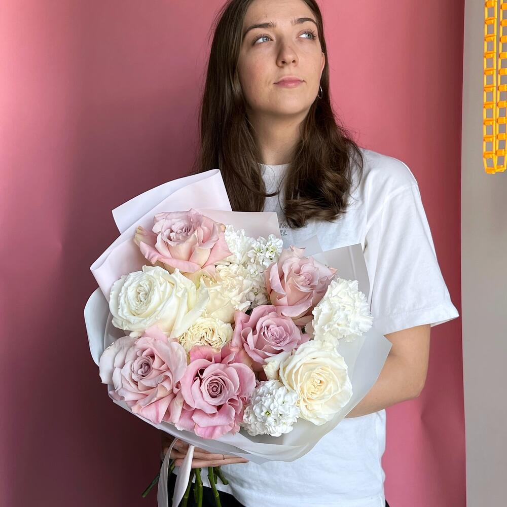 Лента – 1 шт.Маттиола – 2 шт.Гвоздика – 2 шт.Дизайнерская упаковка – 1 шт.роза playa blanca премиум – 4 шт.роза faith премиум – 5 шт.