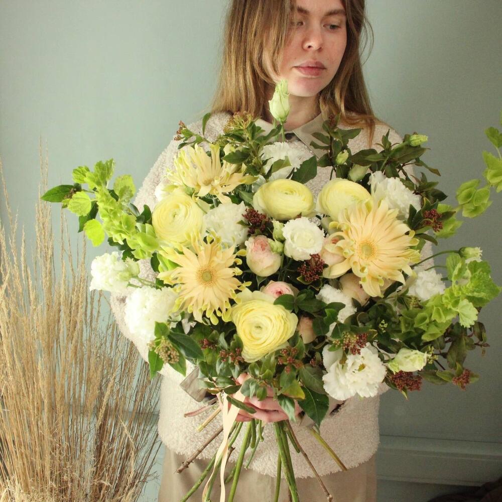 Ранункулюс – 5 шт.Гербера – 3 шт.ирландский колокольчик – 3 шт.Лизиантус – 4 шт.Роза кустовая пионовидная – 2 шт.Вибурнум – 3 шт.Лента атласная – 1 шт.