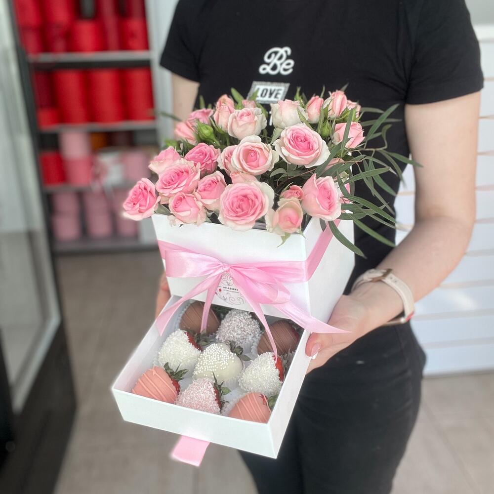 Мини шкатулка с кустовыми розами (9 клубничек в шоколаде)
