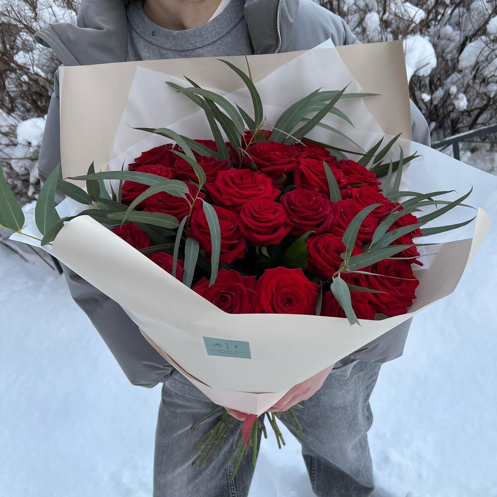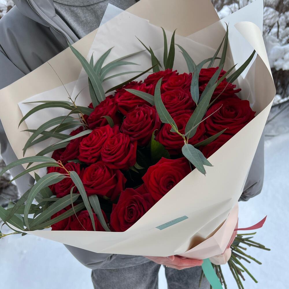 Красная роза 50 см – 25 шт.Эвкалипт – 5 шт.Дизайнерская упаковка – 1 шт.Лента атласная – 1 шт.