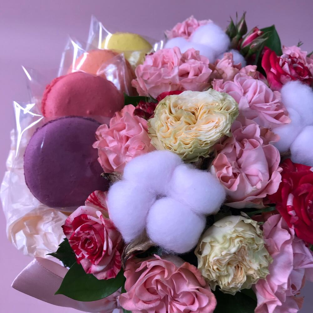 роза кустовая кружевная – 5 шт.Хлопок – 3 шт.Лента атласная – 1 шт.Тишью – 1 шт.Шляпная коробка – 1 шт.Оазис флористический – 1 шт.макарон (пирожное) – 4 шт.Рускус – 3 шт.