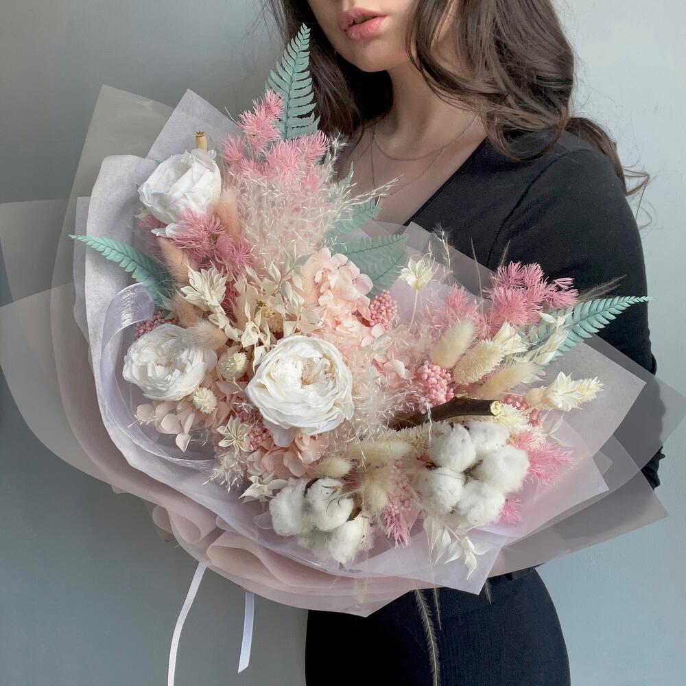 Гортензия – 1 шт.Озотамнус – 2 шт.Папоротник – 1 шт.Рускус – 2 шт.Хлопок – 2 шт.Аспарагус – 1 шт.Упаковка дизайнерская – 1 шт.Роза стабилизированная – 3 шт.Ковыль – 3 шт.Нигелла – 1 шт.Лагурус – 12 шт.Мак – 2 шт.Фаларис – 8 шт.пампасная трава – 1 шт.