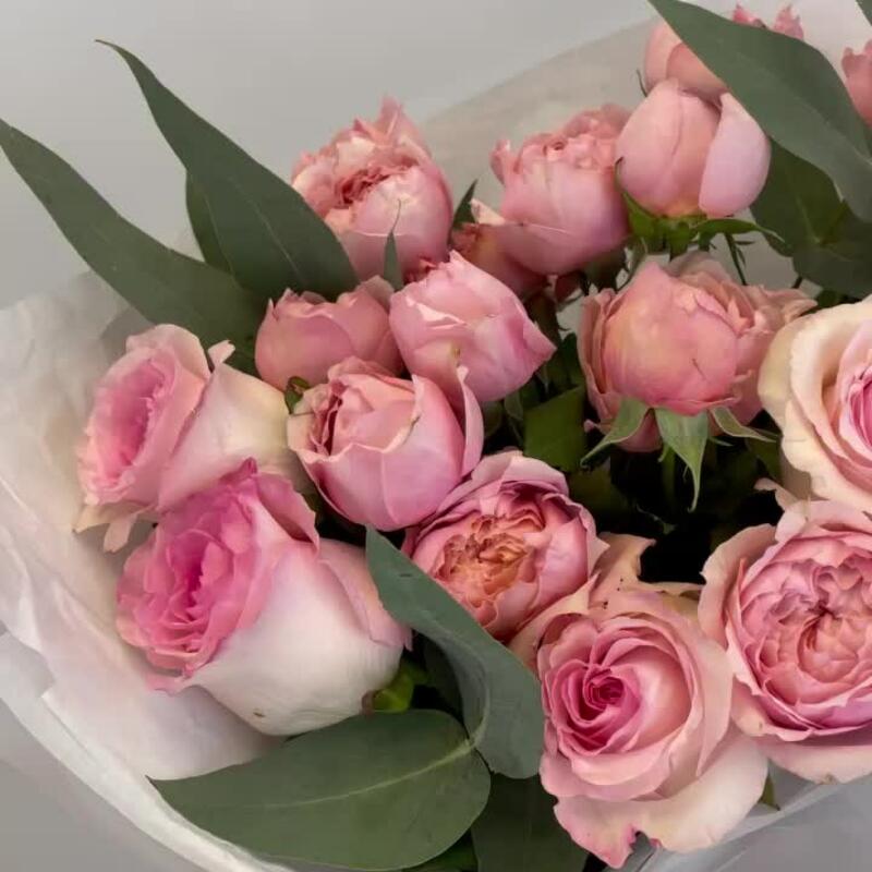 Эвкалипт – 2 шт.Роза – 5 шт.Тишью – 2 шт.Кустовая пионовидная роза – 4 шт.Упаковка дизайнерская – 1 шт.