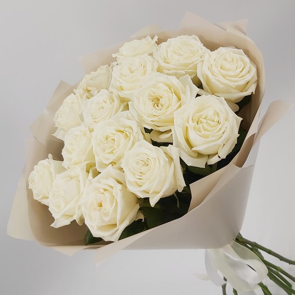 Лента – 1 шт. Упаковка – 3 шт. Роза белая – 15 шт.